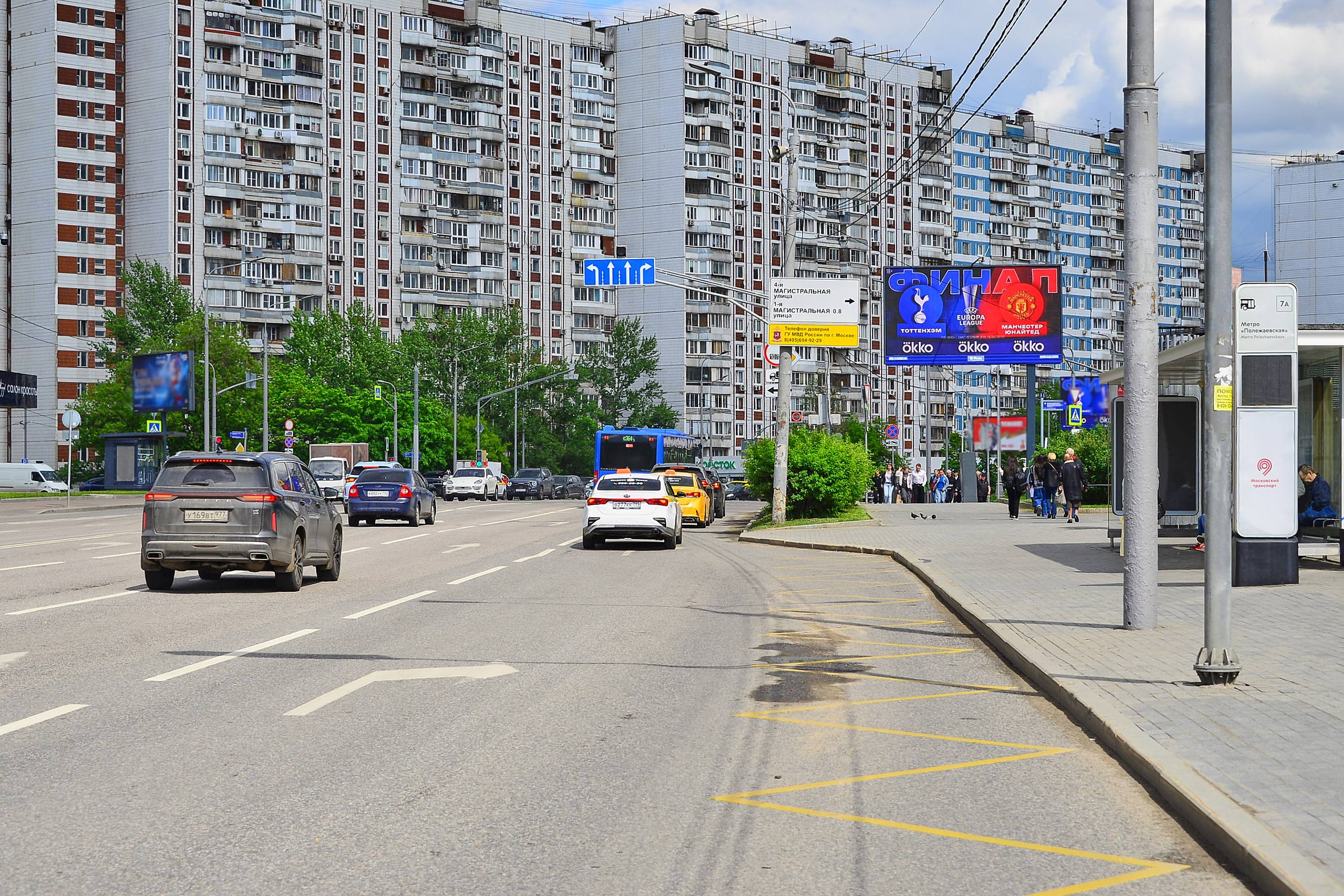 Хорошевское шоссе 35к2, после X с ул. Куусинена, (светофор, м. "Полежаевская")